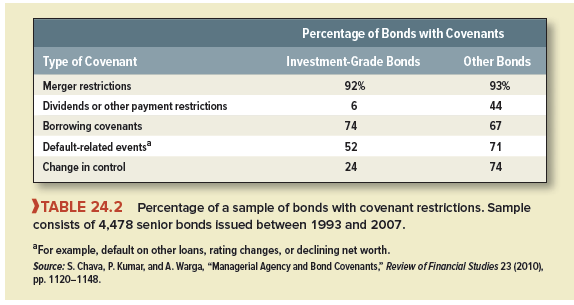 Take a look at Table 24.2, which summarizes the principal covenants in a large sample of senior bond issues. These covenants prevent the company from taking certain actions that would reduce the value of their bonds. Notice that investment-grade bonds tend to have fewer restrictions than high-yield bonds. For example, restrictions on the amount of any dividends or repurchases are less common in the case of investment-grade bonds.