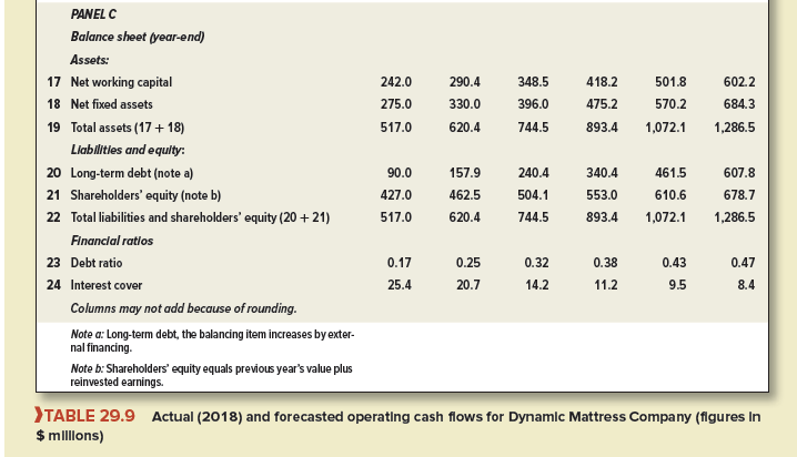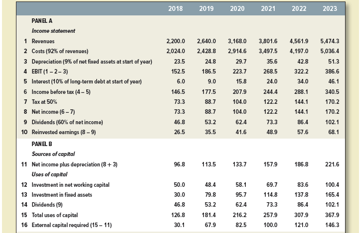 Step 2 Project what additional investment in net working capital and fixed assets will be needed to support this increased activity and how much of the net income will be paid out as dividends. The sum of these expenditures gives you the total uses of capital. If the total uses of capital exceed the cash flow generated by operations, Dynamic will need to raise additional long-term capital. Panel B of Table 29.9 shows these capital requirements. The first column shows that in 2018 Dynamic needed to raise $30 million of new capital. The remaining columns forecast its capital needs for the following five years. For example, you can see that Dynamic will need to issue $67.9 million of debt in 2019 if it is to expand at the planned rate and not sell more shares.