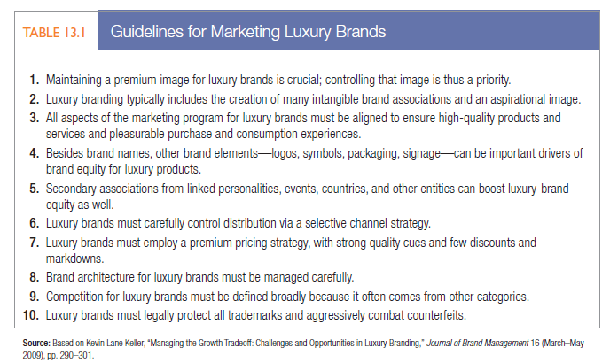Just like marketers in less expensive categories, those guiding the fortunes of luxury brands operate in a constantly evolving marketing environment. Globalization, new technologies, financial crises, shifting consumer cultures, and other forces require them to be skillful and adept at their brand stewardship to succeed. Table 13.1 summarizes some key guidelines in marketing luxury brands.