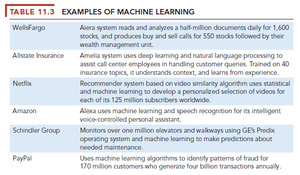 More than 75 percent of AI development today involves some kind of machine learning (ML) accomplished by neural networks, genetic algorithms, and deep learning networks, with the main focus on finding patterns in data, and classifying data inputs into known (and unknown) outputs. Machine learning is based on an entirely different AI paradigm than expert systems. In machine learning there are no experts, and there is no effort to write computer code for rules reflecting an expert’s understanding. Instead, ML begins with very large data sets with tens to hundreds of millions of data points and automatically finds patterns and relationships by analyzing a large set of examples and making a statistical inference. Table 11.3 provides some examples of how leading business firms are using various types of machine learning.