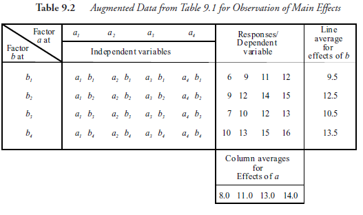 For observation of the main effects, we import the data in Table 9.1, augmented with some derived, additional information, now shown in Table 9.2.