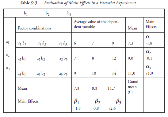 Though these numbers give some idea of the combined effects of multiple factors, the values of main effects, per the definition, require further elaboration. Considering their importance, we will take a close-up look at the main effects, using another, even more simplified example. Firstly, we note that the main effect of a factor a at level l, designated d]_, acting in combination with other factors, by definition, is the difference between the mean of all the values of the dependent variable at aj and the grand mean of all the values of the dependent variable in the entire factorial experiment. Using only two independent variables, a and b, both quantitative, acting at only three levels, the main effects, using fictitious numbers, are demonstrated in Table 9.3. Symbols a and @ are used for the main effects of factors a and b, respectively; subscripts with a and @, as with the independent variables, indicate the levels.