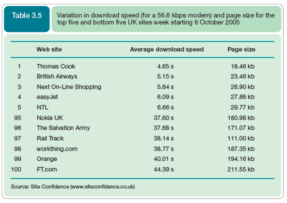 Table 3.5 shows that the top five sites with the lowest download speeds tend to have a much lower page size or ‘weight’ compared with the slower sites from 95 to 100. This shows that the performance of a site is not simply dependent on the hosting with the ISP, but depends on how the site is designed. Such a system is known as a content management system (CMS). As explained in more detail in Chapter 12, a CMS is a means of managing the updating and publication of information on any web site, whether intranet, extranet or Internet. The CMS used can also make a big difference. However, viewing these slower sites over a broadband connection shows that this is perhaps less of an issue than in the days when the majority, rather than the minority, were dial-up Internet users.