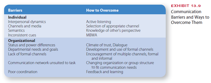 Many of the ideas described in this chapter pertain to barriers to communication and how to overcome them. Exhibit 13.9 lists some of the major barriers to communication, along with some techniques for overcoming them.