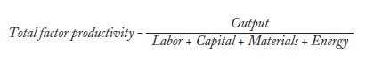 The accurate measure of productivity can be complex. Two approaches for measuring productivity are total factor productivity and partial productivity. Total factor produc- tivity is the ratio of total outputs to the inputs from labor, capital, materials, and energy: