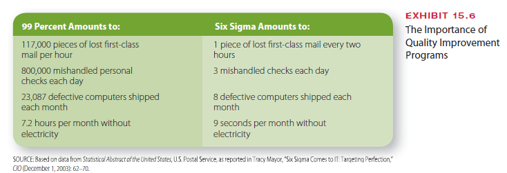 Effectively implementing Six Sigma requires a major commitment from top manage- ment because Six Sigma involves widespread change throughout the organization. Hun- dreds of organizations have adopted some form of Six Sigma program in recent years. Highly committed companies, including ITT Industries, Motorola, General Electric, Allied Signal, ABB Ltd., and DuPont & Co., send managers to weeks of training to become qualified as Six Sigma “black belts.” These black belts lead projects aimed at improving targeted areas of the business.35 Although originally applied to manufacturing, Six Sigma has evolved to a process used in all industries and affecting every aspect of company operations, from human resources to customer service. Exhibit 15.6 lists some statistics that illustrate why Six Sigma is important for both manufacturing and service organizations. Cox Communications, Inc., based in Atlanta, Georgia, used Six Sigma to improve the “time to answer” metric for the company’s help desk. According to Tom Guthrie, vice president of operations, the process enabled Cox to reduce staffing by 20 percent, saving big bucks, while also cutting the aban- don rate (the number of calls abandoned before being answered) by 40 percent.36