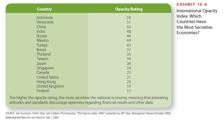 Managers in some countries have more trouble running an open-book company because prevailing attitudes and standards encourage confidentiality and even secrecy concerning financial results. Many businesspeople in countries such as China, Russia, and Indonesia, for example, are not accustomed to publicly disclosing financial details, which can present prob- lems for multinational companies operating there.47 Exhibit 15.8 lists a portion of a recent Opacity Index, which offers some indication of the degree to which various countries are open regarding economic matters. The higher the rating, the more opaque, or hidden, the economy of that country. In the partial index in Exhibit 15.8, Indonesia has the highest opacity rating at 59, and Finland the lowest at 13. The United States has an opacity rating of 21, which is fairly low on the index of countries. In countries with higher ratings, financial figures are typically closely guarded and managers may be discouraged from sharing information with employees and the public. Globalization is beginning to have an impact on economic opacity in various countries by encouraging a convergence toward global accounting standards that support more accurate collection, recording, and reporting of financial information.