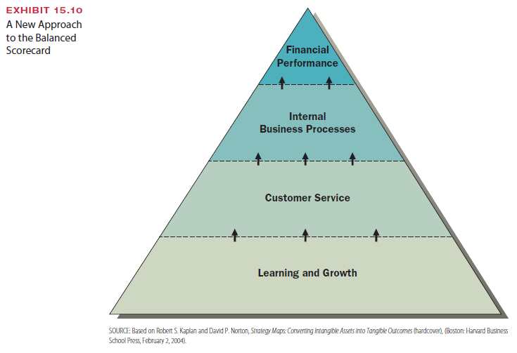 In addition, the scorecard has evolved from a system that places equal emphasis on the four categories of performance management illustrated in Exhibit 15.9 into a cause-effect relation- ship that calls attention to how organizations achieve higher performance. This adapted approach to the scorecard, illustrated in Exhibit 15.10, indicates that financial results are the final outcome of other processes within the company. The foundation of high financial perfor- mance is learning and growth, which reflects that it is an organization’s people and culture that cause excellent business processes. Excellent business processes in turn cause customers to be satisfied. And happy customers lead to financial success. Thus, the components of the scorecard can be organized into a pyramid, indicating that each level shown in Exhibit 15.10 reinforces the level above it. Thus, high financial performance is an outgrowth of success in other areas, starting with a firm commitment to developing human capital and internal business processes.