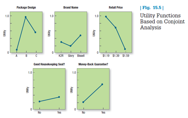 The marketer now uses a statistical program to derive the consumer’s utility functions for each of the five at- tributes (see Figure 15.5). Utility ranges between zero and one; the higher the utility, the stronger the consumer’s preference for that level of the attribute. Looking at packaging, package B is the most favored, followed by C and then A (A has hardly any utility). The preferred names are Bissell, K2R, and Glory in that order. The consumer’s utility varies inversely with price. A Good Housekeeping seal is preferred, but it does not add that much utility and may not be worth the effort to obtain it. A money-back guarantee is strongly preferred.
