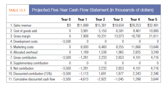 Row 7, the gross contribution, is gross margin minus the preceding three costs. Row 8, supplementary contribution, lists any change in income to other company products caused by the new-product introduction. Dragalong income is additional income to them, and cannibalized income is reduced income.90 Table 15.3 assumes no supplementary contributions. Row 9 shows net contribution, which in this case is the same as gross contribution. Row 10 shows discounted contribution—that is, the present value of each future contribution discounted at 15 percent per annum. For example, the company will not receive $4,716,000 until the fifth year. This amount is worth only $2,346,000 today if the company can earn 15 percent on its money through other investments.91