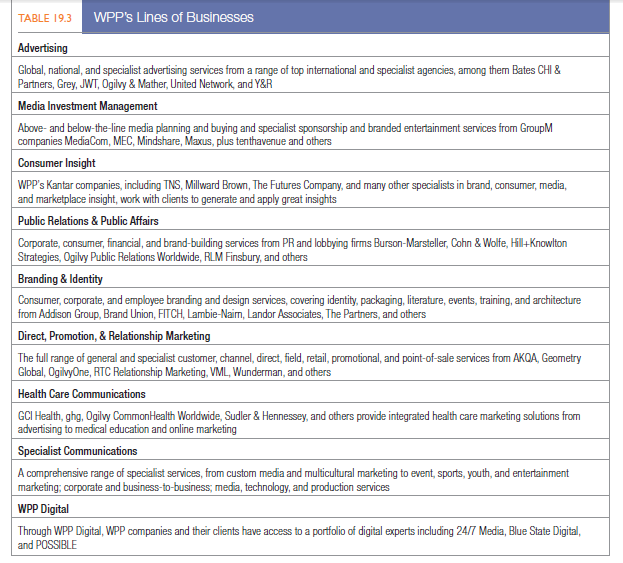 These expanded capabilities make it easier for marketers to assemble various media properties—as well as related marketing services—in an integrated communication program. Table 19.3 lists the different lines of businesses for marketing and advertising services giant WPP, for example.