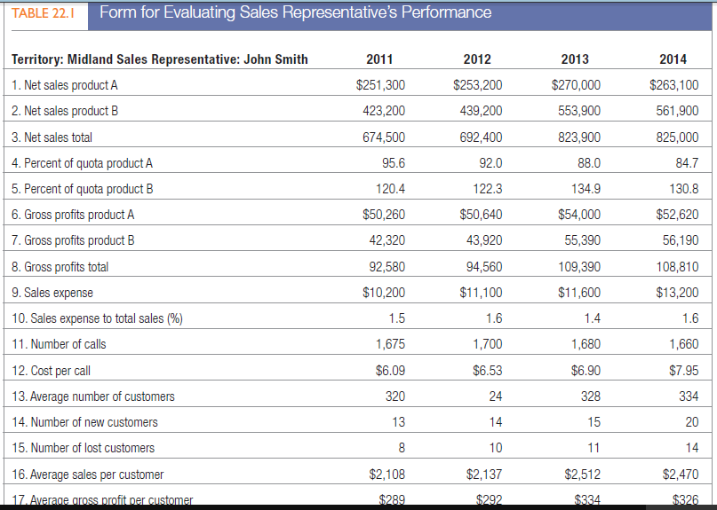 The last two lines show the level and trend in sales and gross profits per customer. These figures become more meaningful when compared with overall company averages. If Smith’s average gross profit per customer is lower than the company’s average, he could be concentrating on the wrong customers or not spending enough time with each customer. A review of annual number of calls (line 11) shows he might be making fewer annual calls than the average salesperson. If distances in the territory are similar to those in other territories, he might not be putting in a full workday, might be poor at sales planning and routing, or might be spending too much time with certain accounts.