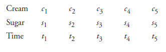 We call our experimenter here “coffee lover.” He guessed that “great” coffee is the result of adding to the fresh brew of a given strength of a given brand of coffee the right quantity of cream and the right quantity of sugar, then drinking it at the right temperature. But, to his disappointment, the experience of “great” coffee did not happen every day. On those rare days that it happened, he secretly said to himself, “Today is my lucky day.” Inclined to be scientific, one day he decides to find the right combination and be done with the luck business. After considerable reflection on his coffee taste, he decides to vary the cream between 0.5 and 2.5 teaspoons in steps of 0.5 teaspoons; to vary the sugar between 0.5 and 2.5 teaspoons in steps of 0.5 teaspoons; and to start drinking after 0.5 and 2.5 minutes in steps of 0.5 minutes, after preparing the cup of coffee, steaming hot.