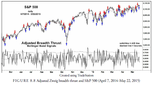 Colby (2003) reports that taking a one-day advance-decline ratio and buying the Dow Jones Industrial Average (DJIA) when the ratio crossed above 1.018 and selling it when the ratio declined below 1.018, in the period from March 1932 to August 2000, would have turned $100 into $884,717,056, assuming no commissions, slippage, or dividends. Turnover, of course, would have been excessive—an average of one trade every 3.47 days—but the results were excellent for both longs and shorts. We tested this system for the period from April 1995 to May 2015 and found that until February 2002, the results were still credible. However, since 2002, the equity line has collapsed. This negates, for now, the one-day method of trading the advance- decline ratio.