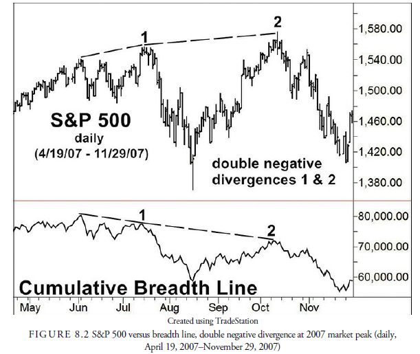 A negative divergence, although not being required, has been the most successful method over the past 50 or more years for warning of a major market top. As with most indicators, different technicians use the breadth indicators in slightly different ways. For example, James F. Hughes, who published a market letter in the 1930s, learned of the breadth divergence concept from Col. Ayres (Harlow, 1968; Hughes, 1951). He used the negative breadth divergences as a major input to his stock market forecasting. Hughes required that at least two consecutive negative breadth divergences, called double divergences (see Figure 8.1), must occur before a major top was signaled. This requirement prevented mistakes in forecasting from the appearance of a single minor divergence that could later be nullified by a new high in both the averages and the breadth line. Often, more than two divergences occur at major market tops.