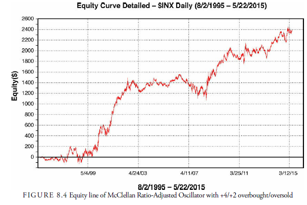In a study of the usefulness of this oscillator, we optimized the possible overbought and oversold levels and found that +4/+2 was the best level. This produced over the period August 1995-May 2015 a 404.4% return for the period over a buy-and-hold profit of 262.9%. The annual rate of return was 8.17%. Figure 8.4 shows the equity line for this study.