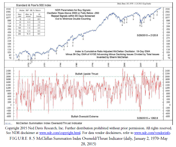 Ned Davis Research, Inc., uses an overbought/oversold thrust-type signal to identify buy levels in the McClellan Summation Index (see Figure 8.5). A thrust buy signal occurs when an oscillator noticeably exceeds its boundaries and rises or falls by a larger amount than usual. The parameters are above 2,000 or below -350. Either signal is valid. The logic is that at a major market price bottom, the steep decline to the bottom is usually a panic and causes an extreme oversold condition. However, coming off the bottom, the market usually rebounds strongly, having formed a “V” pattern, and the upside motion, a thrust, is the greatest time to buy. The best case is when an oversold signal is followed within a short time by an overbought signal. This occurred at the major lows in 1970, 1974, and 2009.