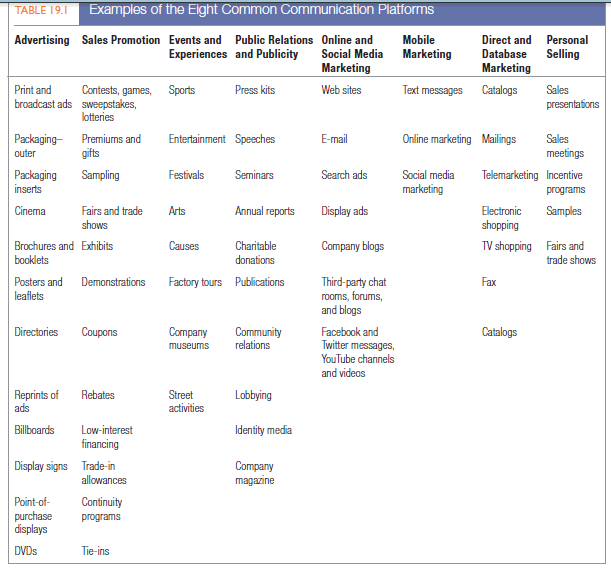 Table 19.1 lists examples of these platforms, but company communication goes beyond these. The product’s styling and price, the shape and color of the package, the salesperson’s manner and dress, the store decor, and the company’s stationery all communicate something to buyers. Every brand contact delivers an impression that can strengthen or weaken a customer’s view of a company.8