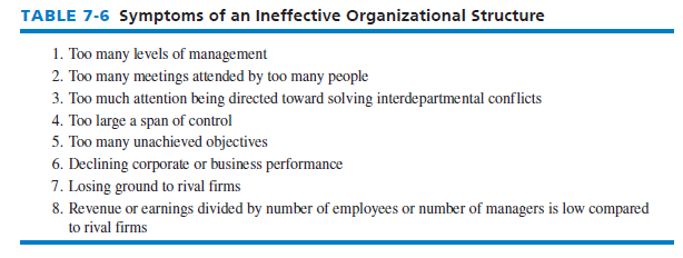 When a firm changes its strategy, the existing organizational structure may become ineffective. As indicated in Table 7-6, symptoms of an ineffective organizational structure include too many levels of management, too many meetings attended by too many people, too much attention being directed toward solving interdepartmental conflicts, too large a span of control, and too many unachieved objectives. Changes in structure can facilitate strategy-implementation efforts, but changes in structure should not be expected to make a bad strategy good, to make bad managers good, or to make bad products sell.