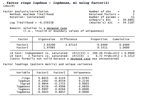 Maximum-likelihood factoring, unlike Stata’s other factor options, provides formal hypothesis tests that help in determining the appropriate number of factors. To obtain a single maximum- likelihood factor for the planetary data, type