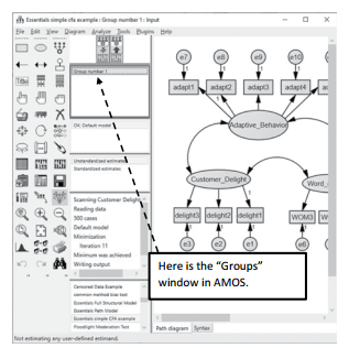 Let’s look at how to set up a multi-group analysis and test for configural invariance. Refer- ring back to our original example, we now want to see if first-time customers are different from repeat customers.The first step is to go to the “Groups” area in AMOS. If no groups are specified, AMOS will default to one group and call it “Group number 1”. You will need to double click into “Group number 1” to bring up the “Manage Groups” window.