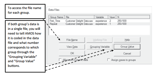 (You can also access the “Manage Groups” window by going to the “Analyze” menu at the top of AMOS and then select Manage Groups). In the Manage Groups window, change the name of the group to whatever you desire. I am calling the first group “First_Time” to rep- resent the first-time customers. To create a second group, you need to hit the “New” button on the bottom of the Manage Groups window.This will form a new group (AMOS will call it Group 2 by default) and you should change the name to represent the second group. I’ll call the second group “Repeat”. After forming the groups, you need to tell AMOS where the data is for each group. Select the data file icon