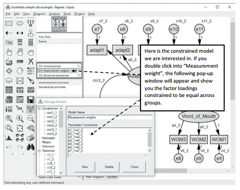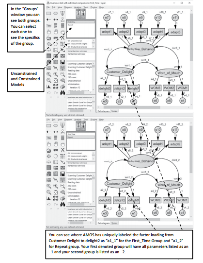 After hitting “OK” you can go back to the main window and see on the left-hand side your groups (First_Time and Repeat). Right below that will be the unconstrained model along with all the constrained models. See Figure 4.26 for an example of what your model should look like for running the analysis. Note, if you ask AMOS to label all your parameters, it will use the letter “a” for factor loadings, “v” for error terms, and “ccc” for covariances.