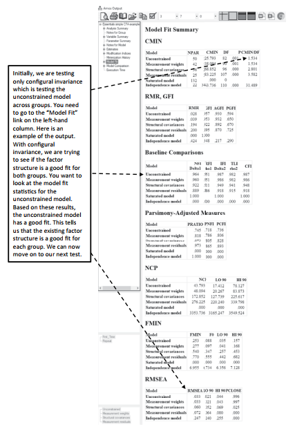 Again, with any of these tests, you are trying to determine if a significant chi-square difference exists between the unconstrained and constrained models.The goal is to have a non-significant finding, noting that the measurement properties do not differ across the groups.