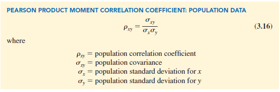 Equation (3.15) shows that the Pearson product moment correlation coefficient for sample data (commonly referred to more simply as the sample correlation coefficient) is computed by dividing the sample covariance by the product of the sample standard deviation of x and the sample standard deviation of y.