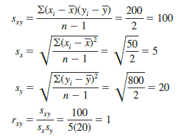 The straight line drawn through each of the three points shows a perfect linear relationship between x and y. In order to apply equation (3.15) to compute the sample correlation we must first compute s, sx, and sy. Some of the computations are shown in Table 3.8. Using the results in this table, we find