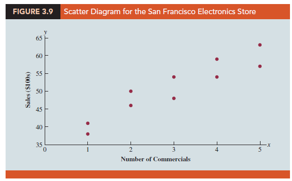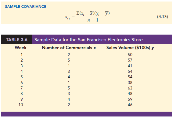 We begin by reconsidering the application concerning an electronics store in San Francisco as presented in Section 2.4. The store’s manager wants to determine the relationship between the number of weekend television commercials shown and the sales at the store during the following week. Sample data with sales expressed in hundreds of dollars are provided in Table 3.6. It shows 10 observations (n = 10), one for each week. The scatter diagram in Figure 3.9 shows a positive relationship, with higher sales (y) associated with a greater number of commercials (x). In fact, the scatter diagram suggests that a straight line could be used as an approximation of the relationship. In the following discussion, we introduce covariance as a descriptive measure of the linear association between two variables.
