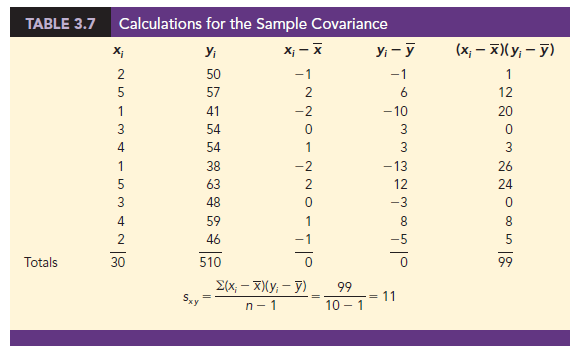 To measure the strength of the linear relationship between the number of commercials x and the sales volume y in the San Francisco electronics store problem, we use equation (3.13) to compute the sample covariance. The calculations in Table 3.7 show the computation of S(x – X)(yt – y). Note that X = 30/10 = 3 and y = 510/10 = 51. Using equation (3.13), we obtain a sample covariance of