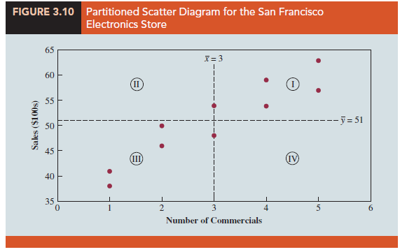 Referring again to Figure 3.10, we see that the scatter diagram for the San Francisco electronics store follows the pattern in the top panel of Figure 3.11. As we should expect, the value of the sample covariance indicates a positive linear relationship with sxy = 11.