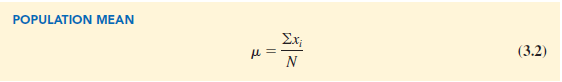 Equation (3.1) shows how the mean is computed for a sample with n observations. The formula for computing the mean of a population remains the same, but we use different notation to indicate that we are working with the entire population. The number of observations in a population is denoted by N and the symbol for a population mean is μ.