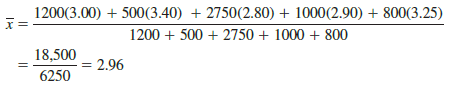 Note that the cost per pound varies from $2.80 to $3.40, and the quantity purchased varies from 500 to 2750 pounds. Suppose that a manager wanted to know the mean cost per pound of the raw material. Because the quantities ordered vary, we must use the formula for a weighted mean. The five cost-per-pound data values are X4 = 3.00, X2= 3.40, X3 = 2.80, X4 = 2.90, and X5 = 3.25. The weighted mean cost per pound is found by weighting each cost by its corresponding quantity. For this example, the weights are w1 = 1200, w2 = 500, w3 = 2750, w4 = 1000, and w5 = 800. Based on equation (3.3), the weighted mean is calculated as follows: