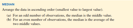 The median is another measure of central location. The median is the value in the middle when the data are arranged in ascending order (smallest value to largest value). With an odd number of observations, the median is the middle value. An even number of observations has no single middle value. In this case, we follow convention and define the median as the average of the values for the middle two observations. For convenience the definition of the median is restated as follows.
