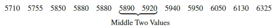 Because n = 12 is even, we identify the middle two values: 5890 and 5920. The median is the average of these values.