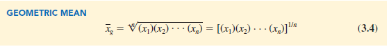 It is important to understand that the arithmetic mean of the percentage annual returns does not provide the mean annual growth rate for this investment. The sum of the 10 annual percentage returns in Table 3.2 is 50.4. Thus, the arithmetic mean of the 10 percentage annual returns is 50.4/10 = 5.04%. A broker might try to convince you to invest in this fund by stating that the mean annual percentage return was 5.04%. Such a statement is not only misleading, it is inaccurate. A mean annual percentage return of 5.04% corresponds to an average growth factor of 1.0504. So, if the average growth factor were really 1.0504, $100 invested in the fund at the beginning of year 1 would have grown to $100(1.0504)10 = $163.51 at the end of 10 years. But, using the 10 annual percentage returns in Table 3.2, we showed that an initial $100 investment is worth $133.45 at the end of 10 years. The broker’s claim that the mean annual percentage return is 5.04% grossly overstates the true growth for this mutual fund. The problem is that the sample mean is only appropriate for an additive process. For a multiplicative process, such as applications involving growth rates, the geometric mean is the appropriate measure of location.