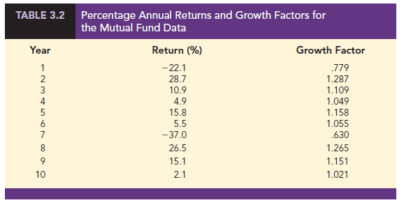 To illustrate the use of the geometric mean, consider Table 3.2, which shows the percentage annual returns, or growth rates, for a mutual fund over the past 10 years. Suppose we want to compute how much $100 invested in the fund at the beginning of year 1 would be worth at the end of year 10. Let’s start by computing the balance in the fund at the end of year 1. Because the percentage annual return for year 1 was -22.1%, the balance in the fund at the end of year 1 would be