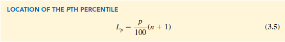 To calculate the pth percentile for a data set containing n observations, we must first arrange the data in ascending order (smallest value to largest value). The smallest value is in position 1, the next smallest value is in position 2, and so on. The location of the pth percentile, denoted Lp, is computed using the following equation: