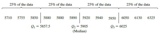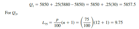 To illustrate the computation of the quartiles for a data set consisting of n observations, we will compute the quartiles for the starting salary data in Table 3.1. Previously we showed that the 50th percentile for the starting salary data is 5905; thus, the second quartile (median) is Q2 = 5905. To compute the first and third quartiles, we must find the 25th and 75th percentiles. The calculations follow.