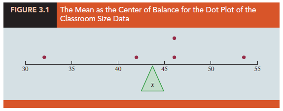 To provide a visual perspective of the mean and to show how it can be influenced by extreme values, consider the dot plot for the class size data shown in Figure 3.1. Treating the horizontal axis used to create the dot plot as a long narrow board in which each of the dots has the same fixed weight, the mean is the point at which we would place a fulcrum or pivot point under the board in order to balance the dot plot. This is the same principle by which a see-saw on a playground works, the only difference being that the see-saw is pivoted in the middle so that as one end goes up, the other end goes down. In the dot plot we are locating the pivot point based upon the location of the dots. Now consider what happens to the balance if we increase the largest value from 54 to 114. We will have to move the fulcrum under the new dot plot in a positive direction in order to reestablish balance. To determine how far we would have to shift the fulcrum, we simply compute the sample mean for the revised class size data.