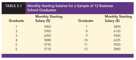 Another illustration of the computation of a sample mean is given in the following situation. Suppose that a college placement office sent a questionnaire to a sample of business school graduates requesting information on monthly starting salaries. Table 3.1 shows the collected data. The mean monthly starting salary for the sample of 12 business college graduates is computed as