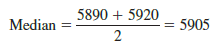 Because n = 12 is even, we identify the middle two values: 5890 and 5920. The median is the average of these values.