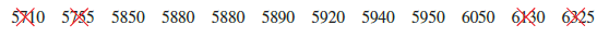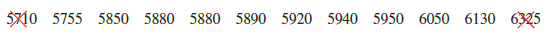 Once the data are in ascending order, we trim pairs of extreme high and low values until no further pairs of values can be trimmed without completely eliminating all the data. For instance, after trimming the lowest observation (5710) and the highest observation (6325) we obtain a new data set with 10 observations.