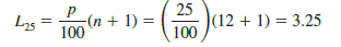 The first quartile, or 25th percentile, is .25 of the way between the value in position 3 (5850) and the value in position 4 (5880). Thus,