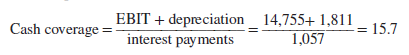 Cash Coverage Ratio In Chapter 26, we pointed out that depreciation is deducted when calculating the firm’s earnings, even though no cash goes out the door. Suppose we add back depreciation to EBIT to calculate operating cash flow.[3] We can then calculate a cash coverage ratio. For Home Depot,