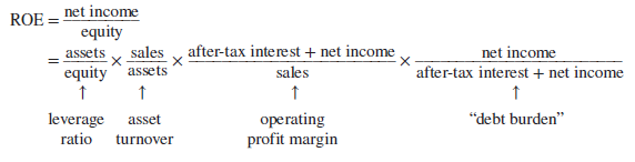 When the firm raises cash by borrowing, it must make interest payments to its lenders. This reduces net profits. On the other hand, if a firm borrows instead of issuing equity, it has fewer equityholders to share the remaining profits. Which effect dominates? An extended version of the Du Pont formula helps us answer this question. It breaks down the return on equity (ROE) into four parts:
