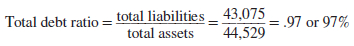 Therefore, Home Depot is financed 97% with long- and short-term liabilities and 3% with equity.[1] We could also say that its ratio of total debt to equity is 43,075/1,454 = 29.6.