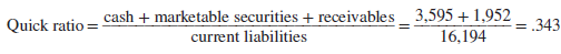 Quick (Acid-Test) Ratio Some current assets are closer to cash than others. If trouble comes, inventory may not sell at anything above fire-sale prices. (Trouble typically comes because the firm can’t sell its inventory of finished products for more than production cost.) Thus, managers often exclude inventories and other less liquid components of current assets when comparing current assets to current liabilities. They focus instead on cash, marketable securities, and bills that customers have not yet paid. This results in the quick ratio: